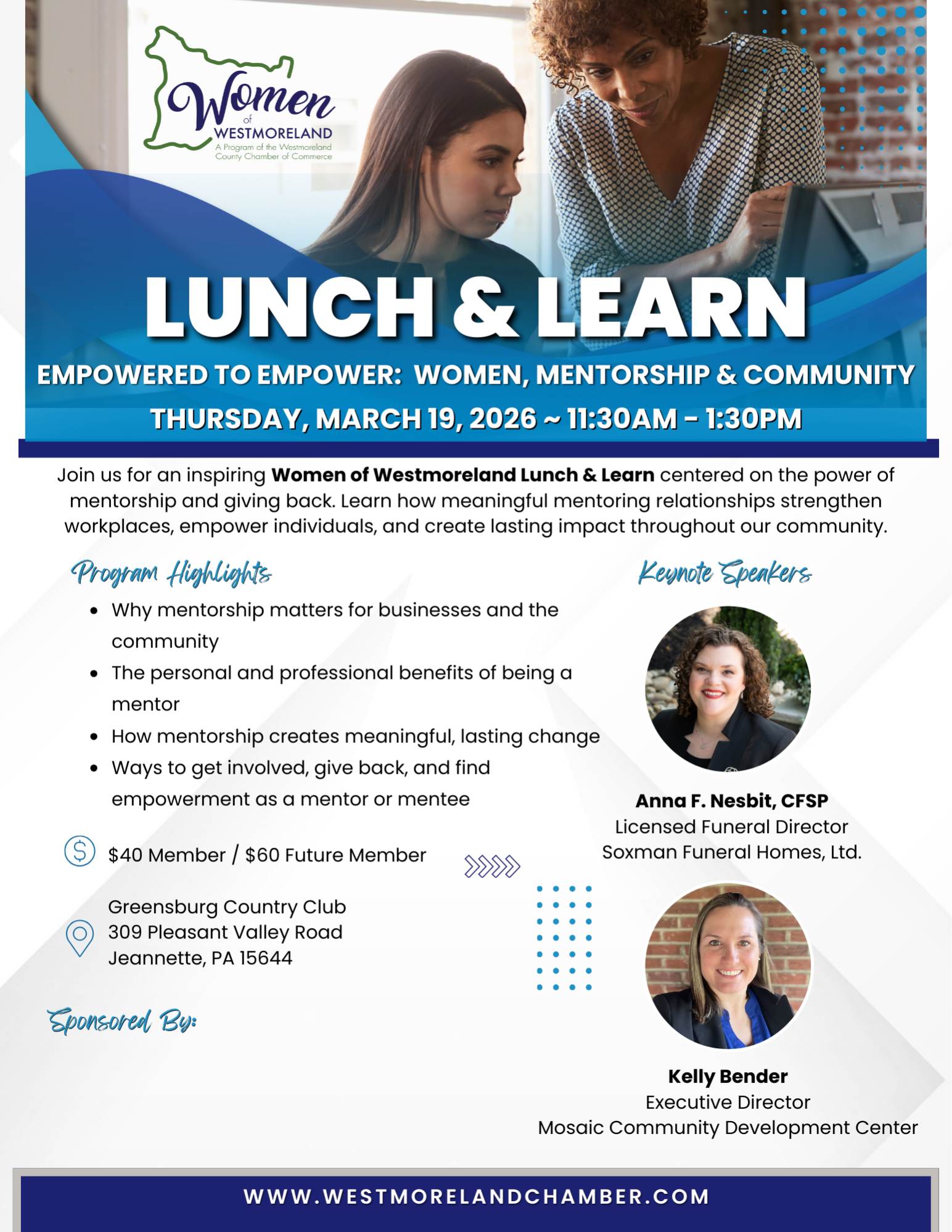Join us for an inspiring Women of Westmoreland Lunch & Learn focused on mentorship, empowerment, and community impact. Discover how mentoring strengthens workplaces, uplifts individuals, and creates lasting change—for both mentors and mentees.