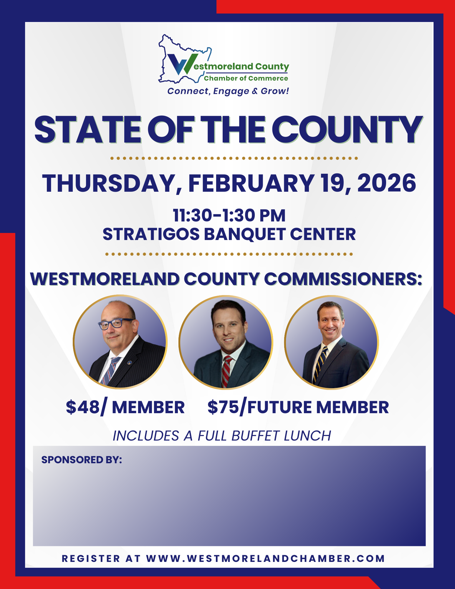Join us for this annual event and hear from our Westmoreland County Commissioners. This is a great opportunity to learn more about their future initiatives and goals for our community. For sponsorship opportunities, please call (724) 834-2900 option 5.