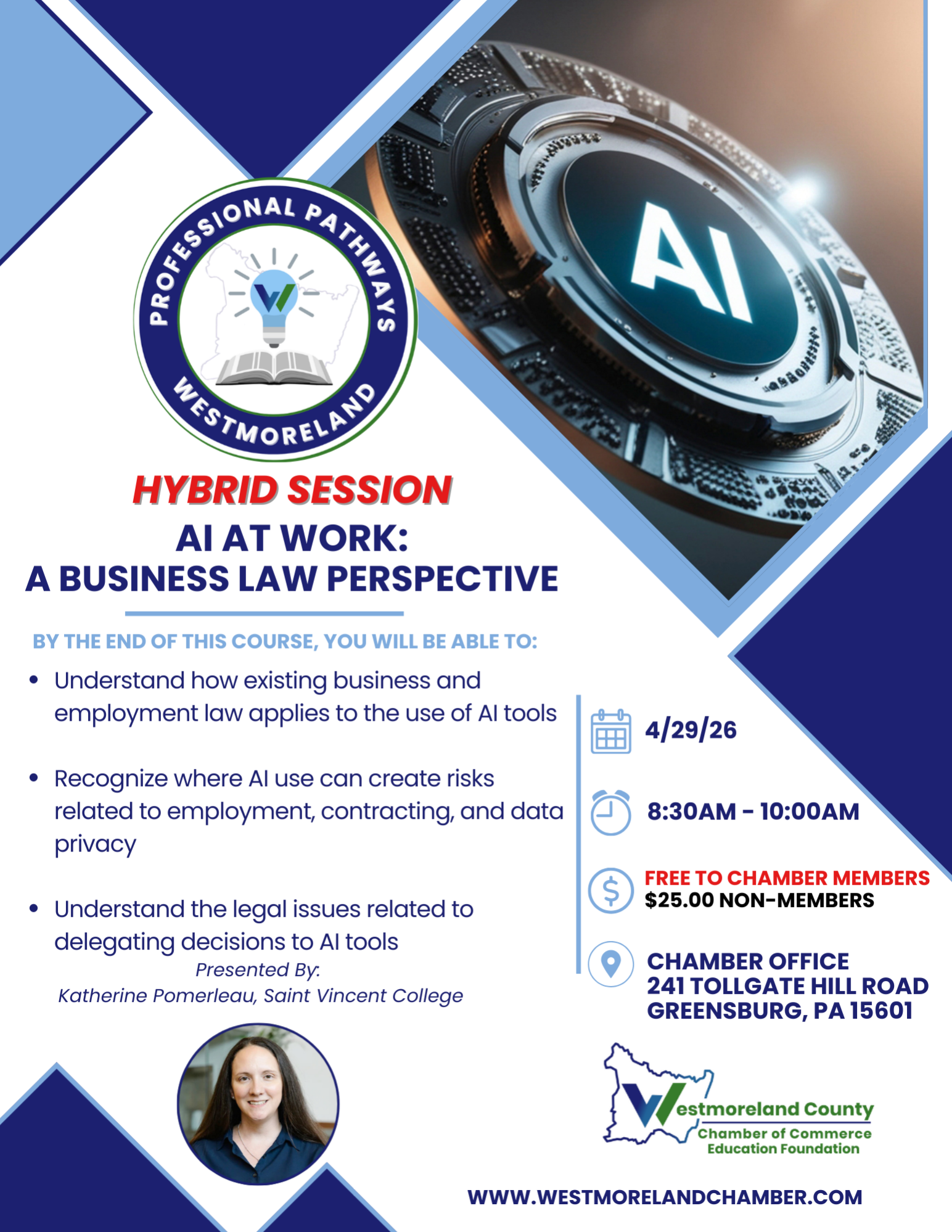 This session explores how existing business and employment laws apply to the use of artificial intelligence in the workplace. Participants will learn how AI tools can introduce legal risks related to employment practices, contracting, and data privacy, and will gain insight into the legal considerations of delegating decision-making to AI systems.