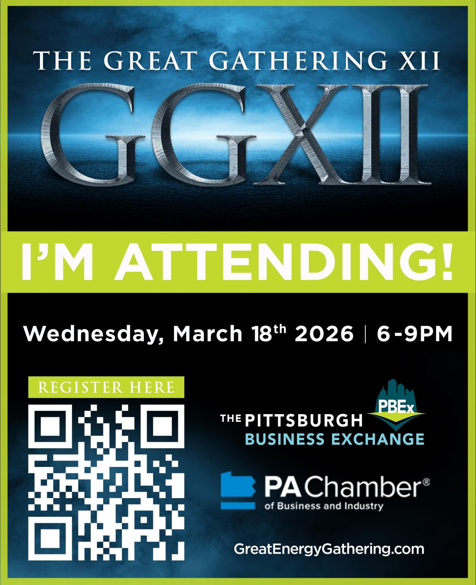 You're invited to the 12th Annual 'Great Energy Gathering' (GGXII) on Wed, March 18th 2026, the largest business networking reception in Western PA. Join the Pittsburgh Business Exchange (PBEX), PA Chamber of Business and Industry, and dozens of powerhouse organizations as we join forces for this energy-themed collaboration. Register Now!
