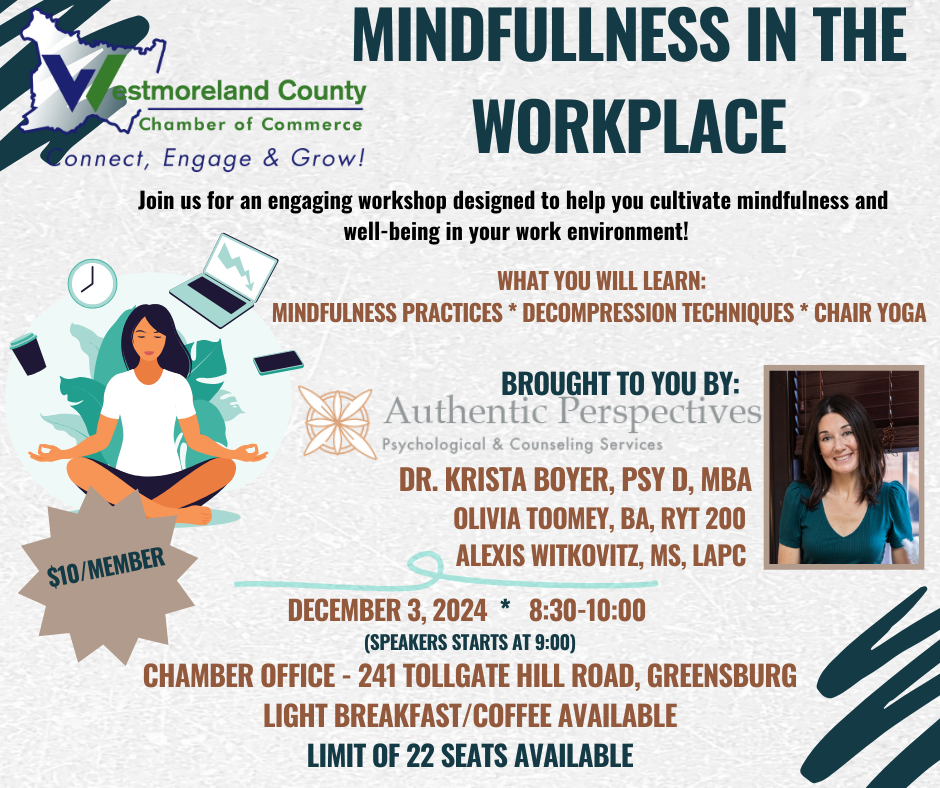 Join Dr. Krista Boyer, Olivia Toomey, and Alexis Witkovitz from Authentic Perspectives Psychological & Consulting Services, LLC for an engaging workshop designed to help you cultivate mindfulness and well-being in your work environment!