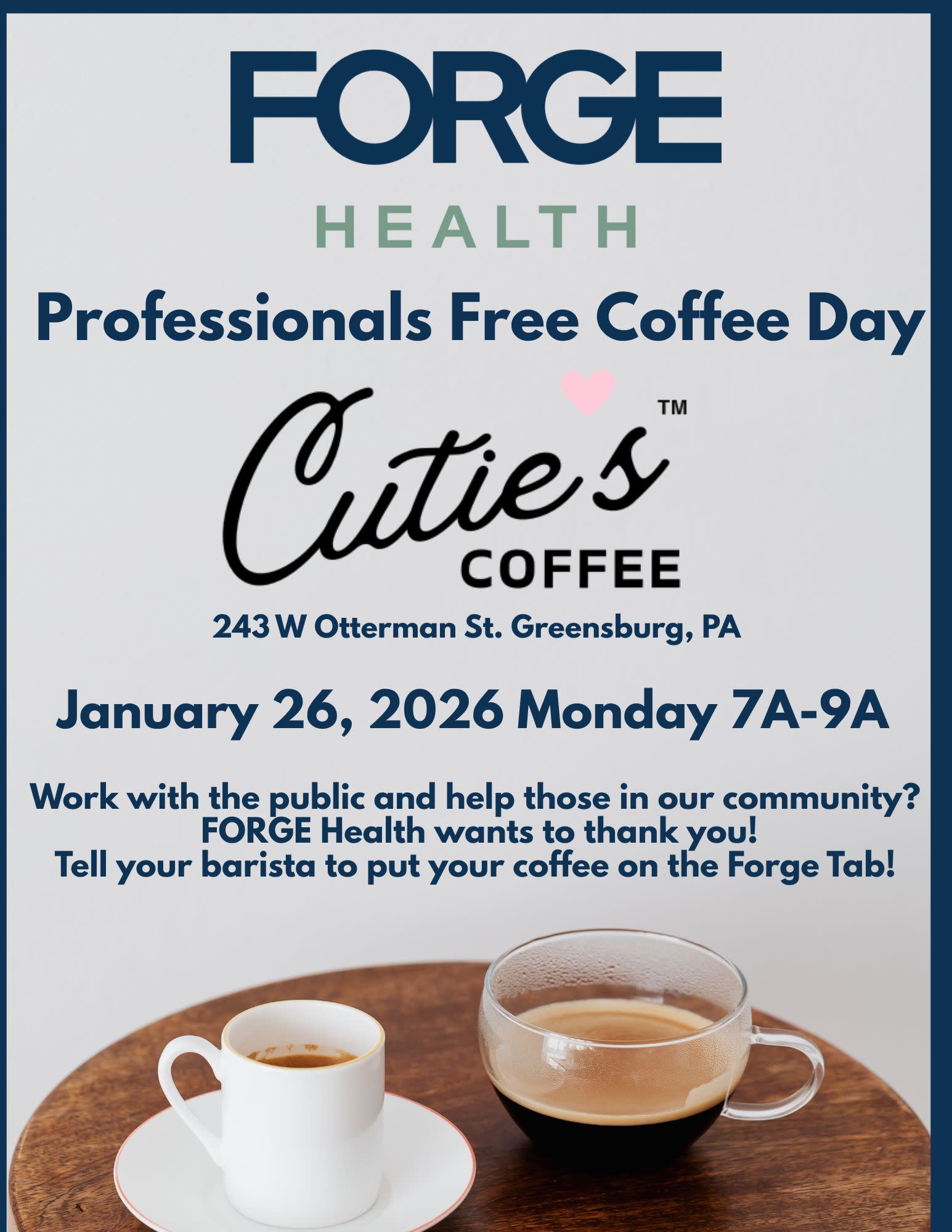 Forge Health will be providing free coffee to those who serve our community. Join us and let your barista know it's on the Forge Tab (ANY custom coffee)